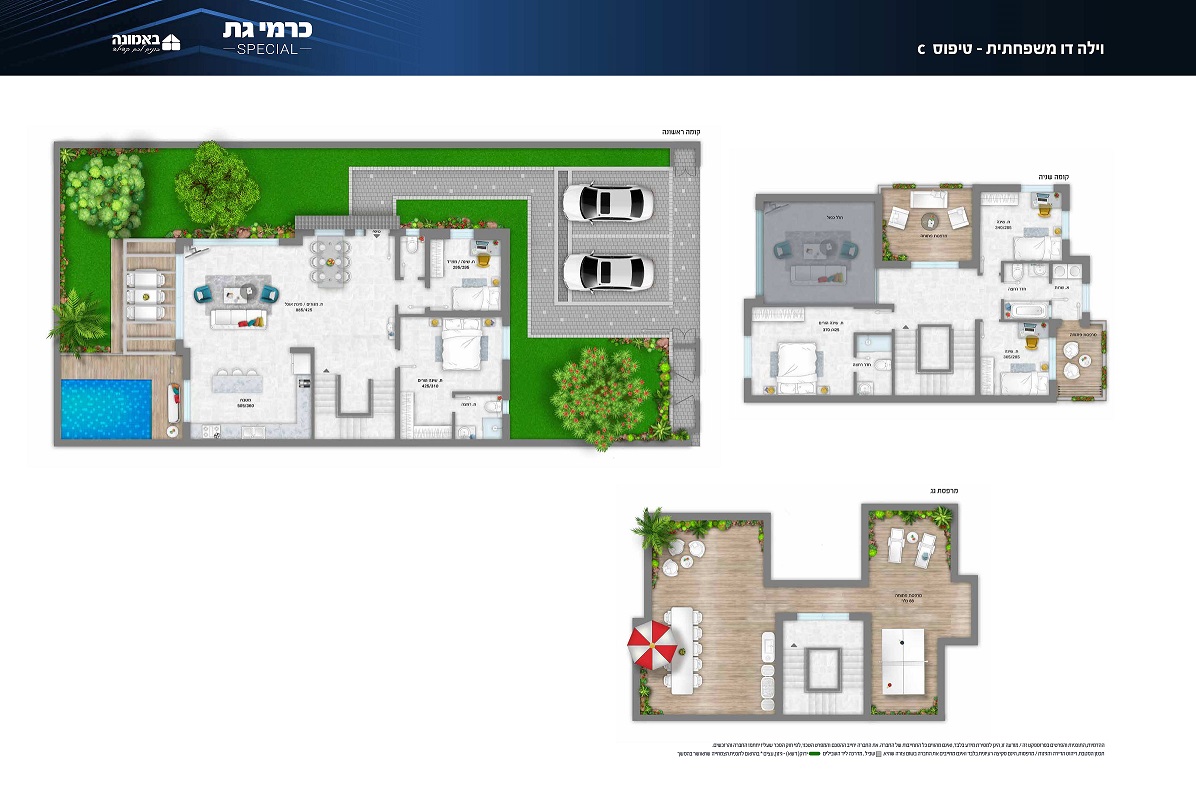 במתחם וילות דו משפחתיות, שישה חדרים, 209 מ"ר בנוי בשני מפלסים עם מרפסת גג גדולה, עם חצר ענקית 170-230 מ"ר ושתי חניות.