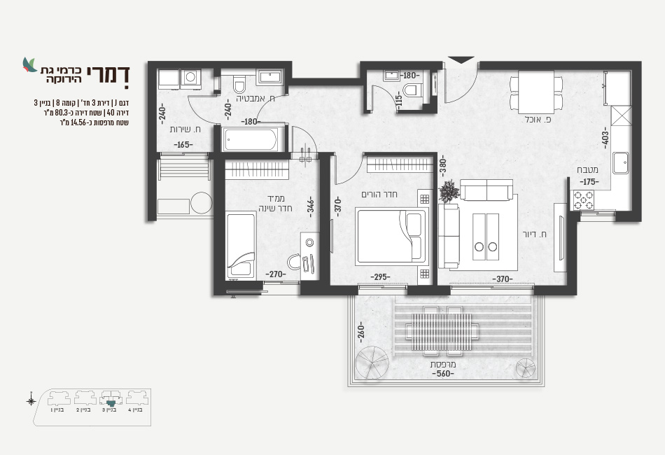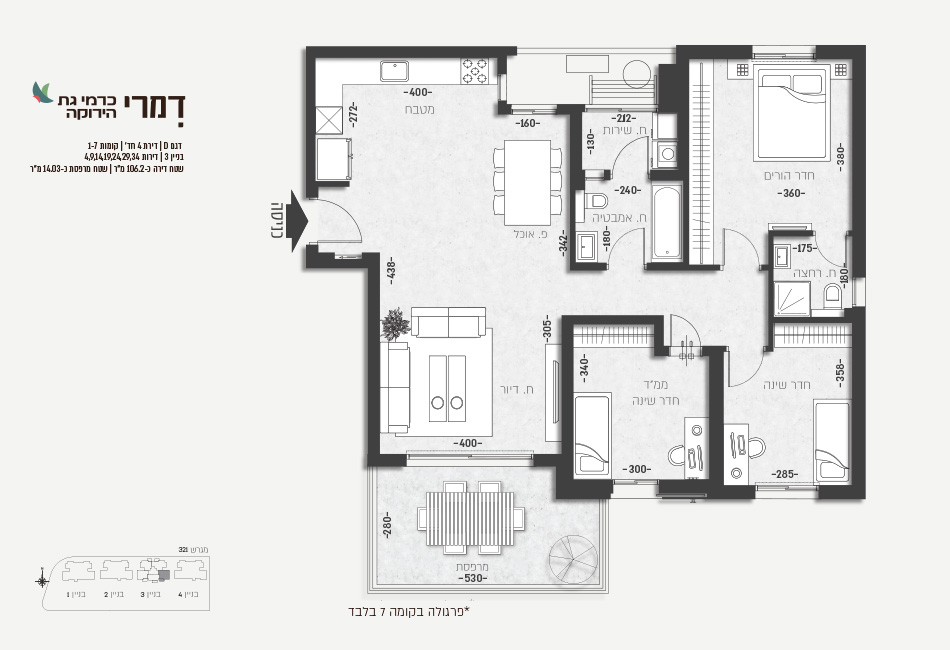 תמהיל הפרוייקט: 4 בניינים, 90 יח"ד