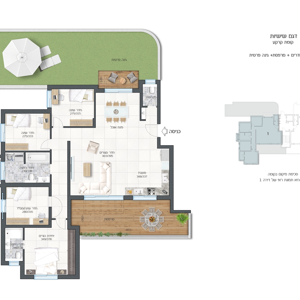דירות חמישה חדרים עם מרפסת שמש סוכה גדולה 25 מ"ר וחניה החל מ 2,416,000 ש"ח. דירות גן חמישה חדרים סה"כ 348 מ"ר במפלס אחד, 143 מ"ר בנוי עם גינה ענקית, 205 מ"ר וחניה ב- 2,828,000 ש"ח. מפרט עשיר ומפנק הכולל, מיזוג אוויר וחניה! הסדר תשלום גמיש ומותאם! נוף מרהיב וירוק! רק 15 דקות מראש העין ותחנת הרכבת! עבודה עברית! איכלוס 05/2027 - הבניה בעיצומה!