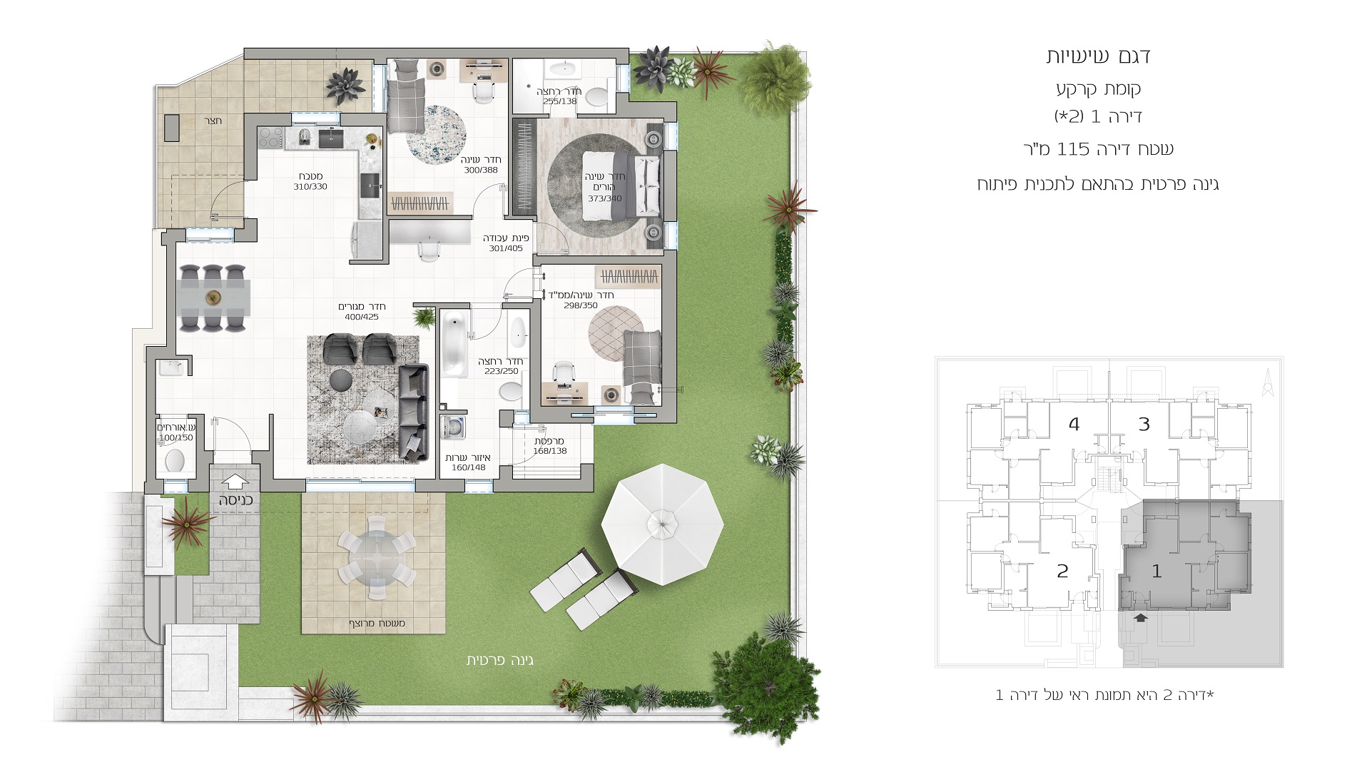דירת גן ארבעה חדרים, 115 מ"ר בנוי עם גינה ענקית 130 מ"ר ב-1,582,000 ש"ח. החלה מכירת הפריסייל מוזמנים להנות מהטבות ומבצעים מיוחדים לזמן מוגבל! מפרט עשיר ומפנק! הסדר תשלום גמיש ומותאם ללא הצמדה למדד! נוף מרהיב וירוק! כניסה פרטית לכל דירה! הנחות מיוחדות למשרתי המילואים!