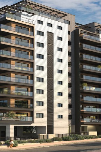 • חיפוי הבניין באבן יוקרתית ושילוב חומר HPL דמוי עץ על פי בחירת אדריכל הפרויקט